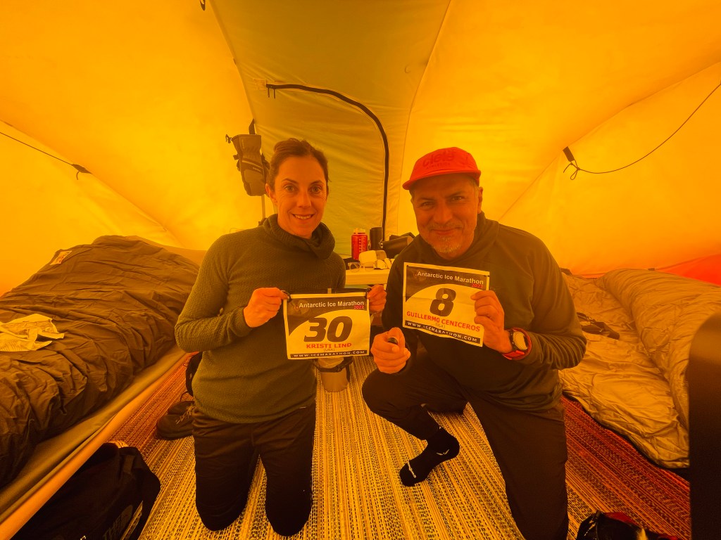 The showers and toilets are communal and are designed to minimize the amount of grey water and solid waste produced. All the waste is placed in large containers and is flown back to Punta Arenas. The bathroom area is about 100 meters from the tents, or farther depending on tent location. Having a pee bottle in the tent is a must to avoid a cold midnight walk. In the morning the pee bottle is emptied into the larger pee container. Goes without saying this is the guest’s responsibility. There are three large tents in the middle of the camp. The first one is the dining tent where three meals are served daily. The food is freshly prepared for each meal and is pretty excellent considering the location. The dining tent is also a communications point with the day’s activities written on a board as well as other group meetings and briefings happening here. A second tent is a lounge/library and the third large tent is for the camp’s operations. Also, there is no Wifi in the camp, but one has the ability to use a satellite phone for $40.00/call. The economy of the camp’s operation is completely driven by purpose. It isn’t luxurious and it shouldn’t be, yet we didn’t feel lacking. Everything around us and in our tents helped us survive in a very inhospitable place. The spartan environment helped further to have everyone’s focus on the race. No distractions, all purpose, every single item at the camp was essential in helping our group of runners fulfill our goal in Antarctica.