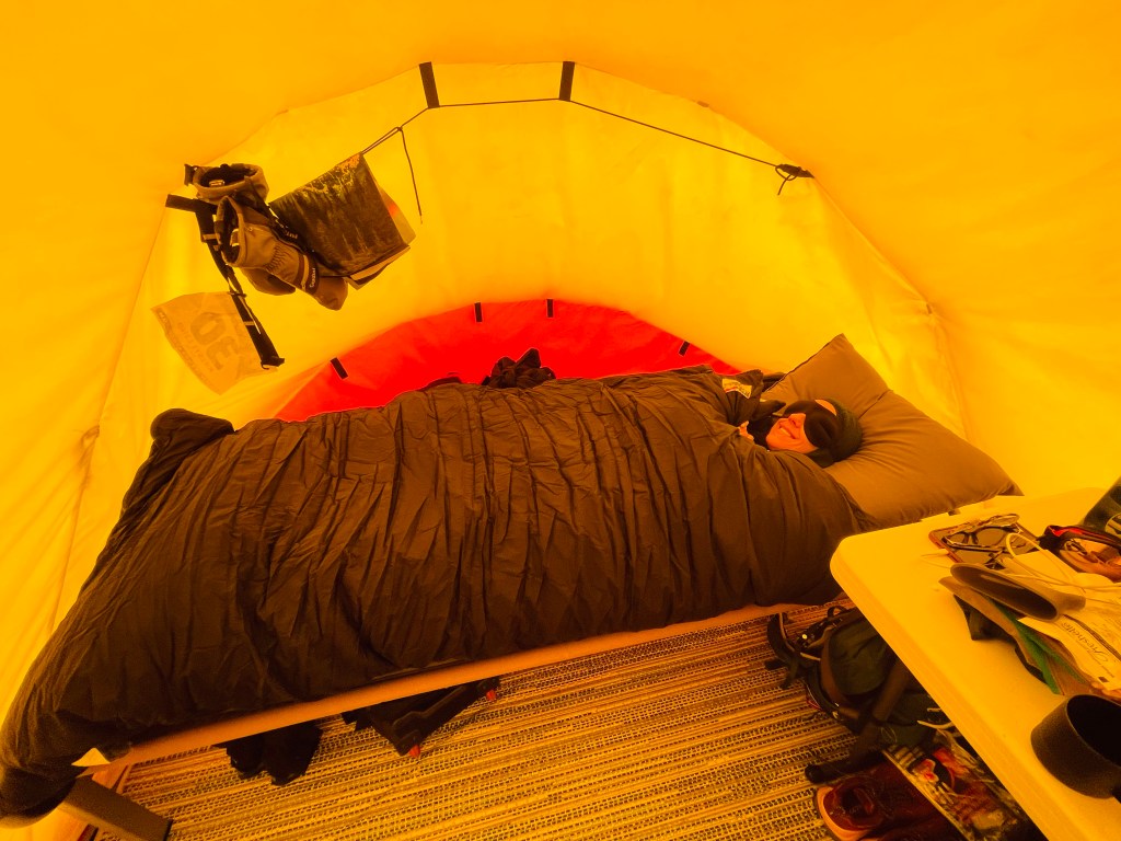 Arriving at the camp the runners were divided into smaller groups for a thorough briefing of the camp’s operation as well as its rules. Union Glacier is a full service tent camp that is completely dismantled by the end of the season. This drives the operators single most important policy, nothing is left behind. The camp is an exercise in operating minimalism that is nothing short of brilliant. The accommodations consist of double occupancy clam shell tents. There are thirty tents for the guests and about twenty for the operating staff including a camp doctor. The double walled tents are designed to be naturally heated by taking in the 24 hour summer sunlight which keeps them up to 60F. Each tent has two cots with thick sleeping bags and a small table. The tents are tall enough to be able to stand up in the middle section and as one heads to the double zippered doors. Eye masks and ear plugs are provided to sleep.