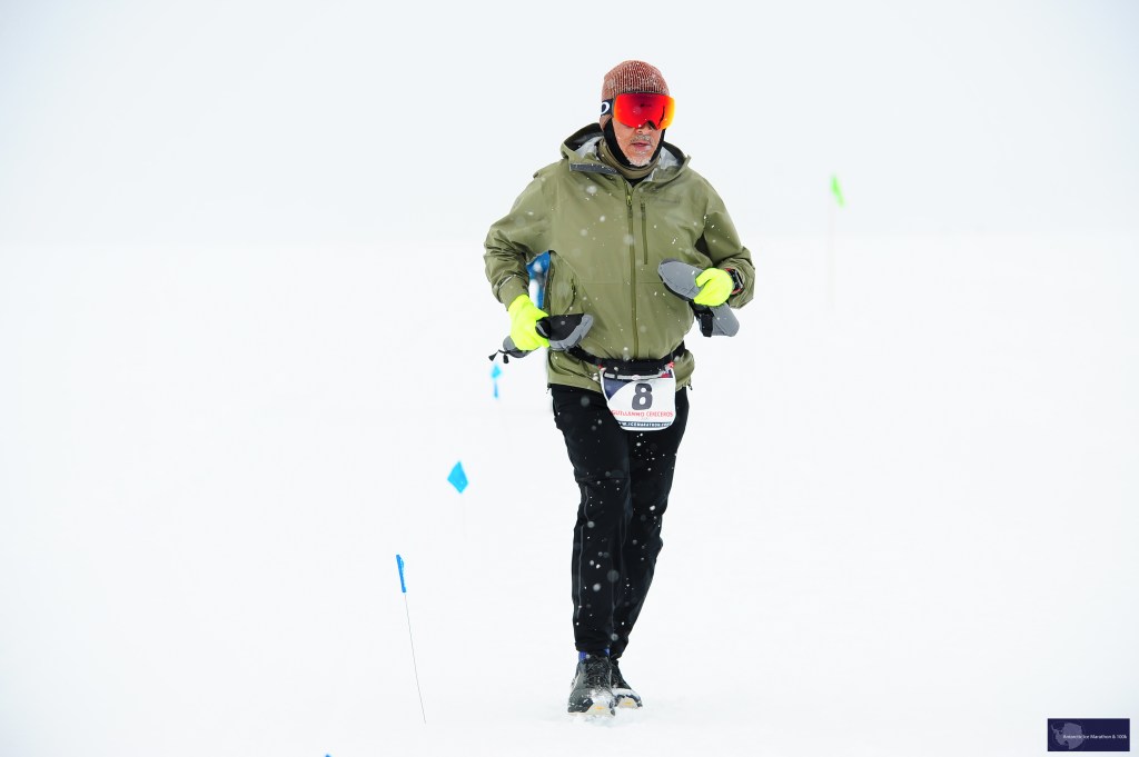 The weather cleared out as we were on the second lap. I am short of words to describe the amazing beauty of the course. There were majestic snow covered mountains on all sides. The Ellsworth Mountains, which are the highest mountain range in Antarctica. The closest set of mountains to our left was about 10 miles away, on all other sides they were about 30 miles from us. There was no color on the mountains, only the grays of rock and the whiteness of ice and snow. There wasn’t a trace of life, not a single tree, plant, bird or animal of any type, it was eerie. Beyond the camp, the signs of humanity were also scarce. By international treaty Antarctica is a no fly zone, so not a single plane in sight during the time we were out running. It was absolutely pristine, as fewer places in the planet now are. It was an irreplicable stage that we had just for ourselves as the runners staggered. I had started to feel my body temperature drop as we approached the aid station and was reminded that in the cold one needs to consume more calories to be able to maintain body heat. It would be embarrassing to admit the amount of cookies I ate at the aid station, however very soon after the cold went away. As we were closing the second lap Kristi had a knee jerk stop. Her injury had started to be more present. She would slow run a distance and then have pain shooting up on the landing motion. She was able to walk as this decreased the pressure on the meniscus. We would walk a distance and then try to slow run until her knee decided not to.