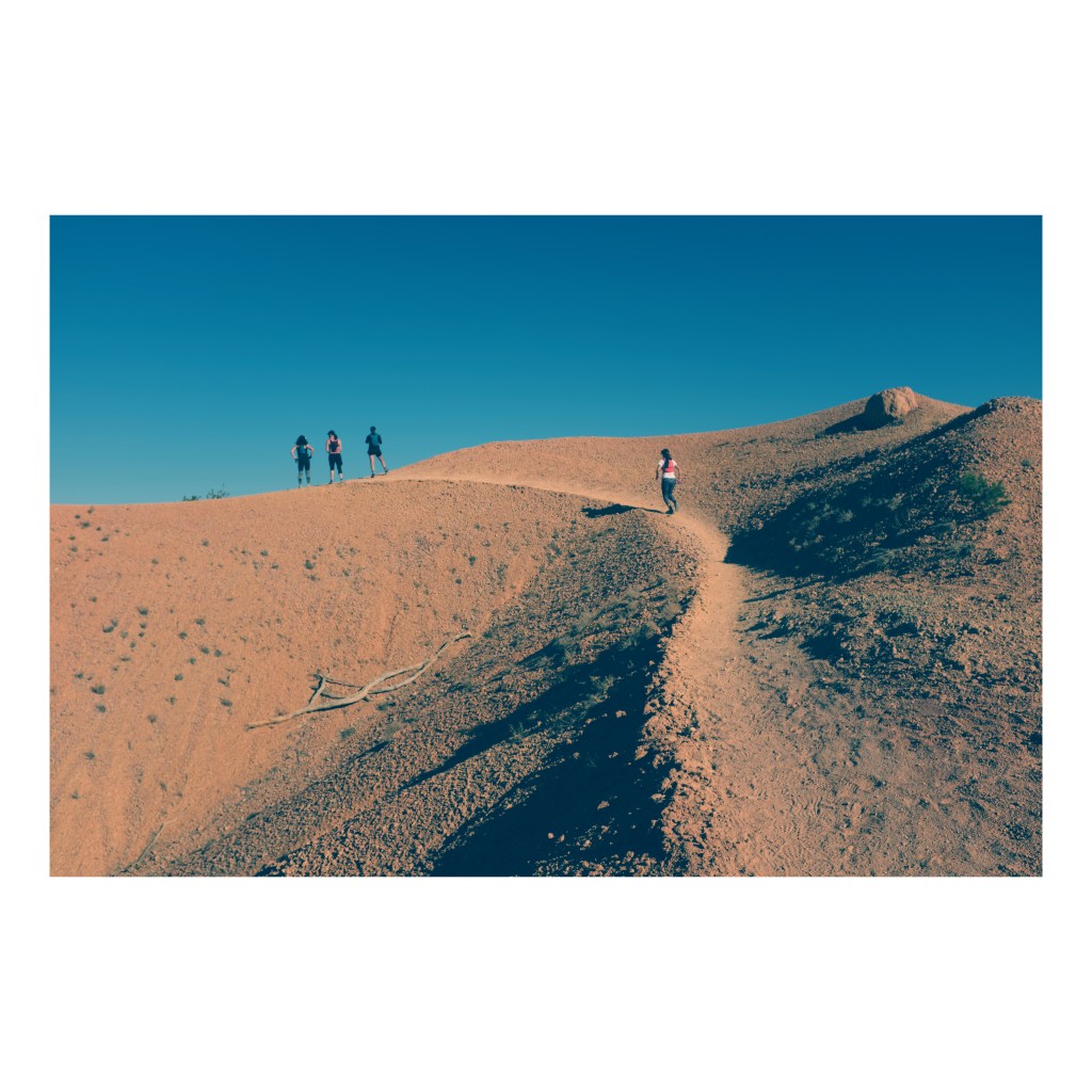 We ran or hiked thru iconic and beautiful nature in circumstances that fully challenged our physical abilities but that were so rewarding that had us in a constant state of flow. We ran at altitude and climbed thousands of feet. I fell while running, landed on my face, the first thing I thought of was how peculiar that the taste of the red sand seemed to be on the sweet side. The red and brown sand of the desert. We had it in our system because every breath we took when we were out moving had a bunch of it. It was in our clothes and in our hair. We felt bad for the travelers who didn’t get far from their vehicles to experience the smell and taste of the sand.